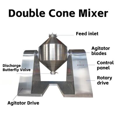 Mesin pencampur kerucut ganda kelas profesional dengan struktur pencampuran kerucut residu rendah untuk pencampuran seragam bahan bubuk atau butiran dalam kimia, farmasi, pengolahan makanan,bahan bangunan, dan industri pestisida.
